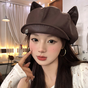可爱卡通猫耳朵pu皮质贝雷帽女小众文艺复古显脸小云朵画家帽子潮