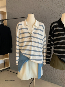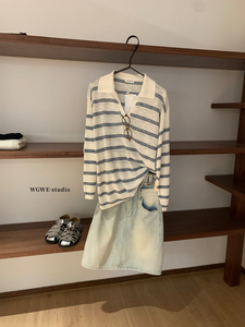 WGWE2025秋装条纹微透薄款宽松显瘦翻领防晒罩衫V领长袖T恤W6855