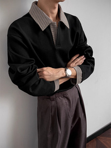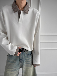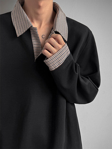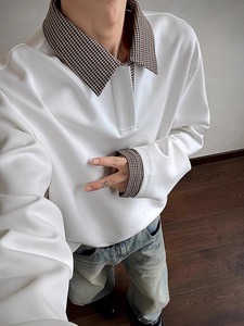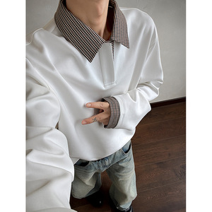 跨境美式千鸟格拼接白色男秋季风穿搭长袖POLO衫重磅翻领POLO衫男