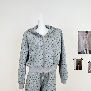 【玉兔花事】美式复古灰色碎花兔耳朵连帽开衫卫衣香蕉裤套装