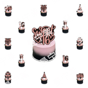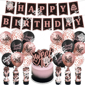 sweet黑玫瑰金16岁生日派对装饰拉旗气球背景布蛋糕插排派对用品