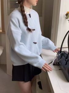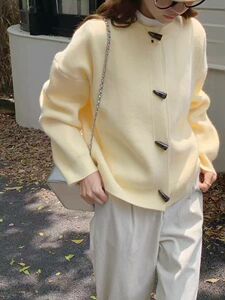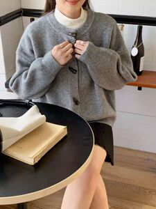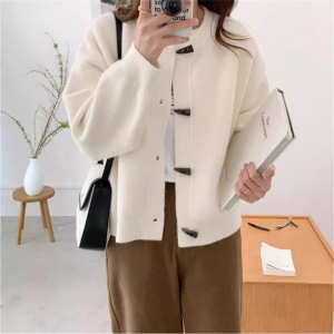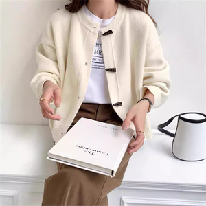 圆领牛角扣针织开衫女春秋季新款宽松百搭纯色设计感上衣长袖外套