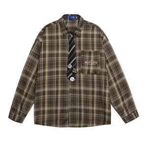 美式复古字母刺绣宽松休闲潮流百搭男女情侣秋季格子领带衬衣外套