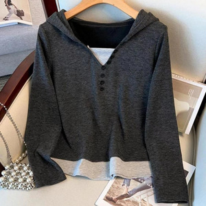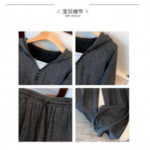 慵懒连帽假两件上衣阔腿裤两件套大码大码胖mm休闲气质套装女