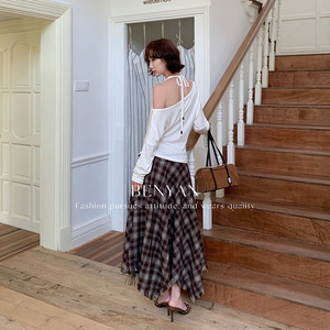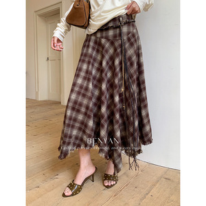 BENYAN本言 秋法式复古流苏格子A字显瘦半身裙女【送腰绳】82325