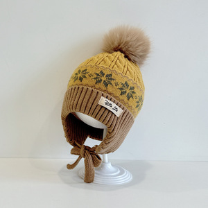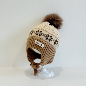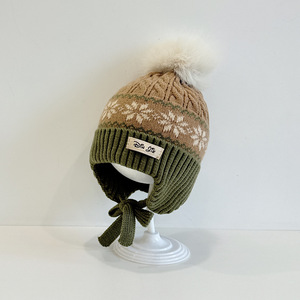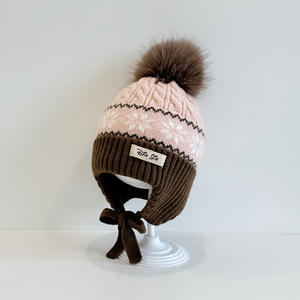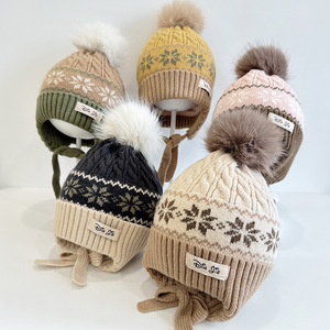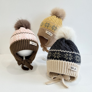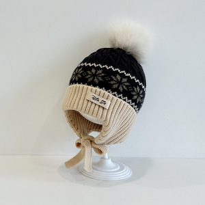 提雪花护耳宝宝帽子秋冬季毛球护耳针织帽男童女孩雷锋保暖毛线帽