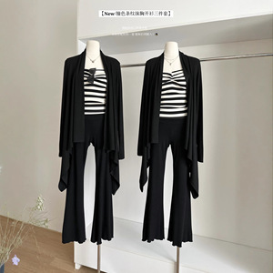 黑白条纹抹胸背心女长袖开衫外套秋季穿搭套装微喇叭休闲裤三件套