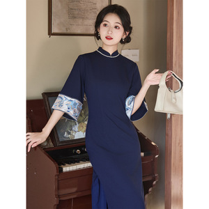 洛士博中式旗袍2025新款改良蓝色小个子独特漂亮日常可穿素雅长袖