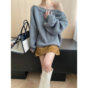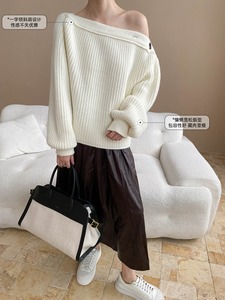 司南 慵懒氛围 设计感纽扣一字领斜肩宽松显瘦毛衣针织衫 SN7855