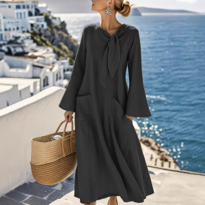 欧美跨境秋季新款女装休闲宽松时尚纯色棉麻圆领长袖口袋连衣裙