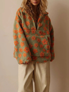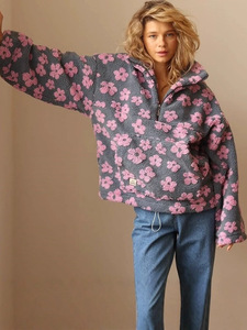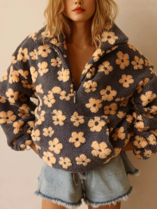 欧美跨境女装2025春季新款时尚仿羊羔毛印花宽松拉链卫衣长袖上衣