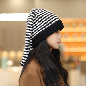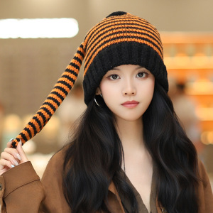 日系可爱条纹兔耳朵毛线帽女秋冬百搭显脸小保暖护耳针织套头帽子