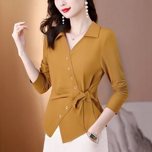 一件代发2025秋季新款时尚翻领纯色系带洋气百搭长袖打底衫上衣