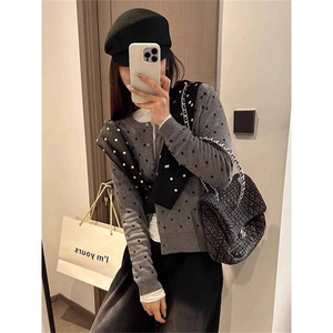 韩系设计感灰色波点针织开衫女春秋新款软糯毛衣外套内搭短款上衣