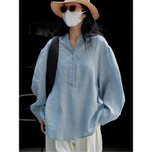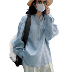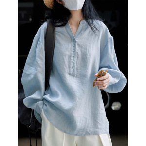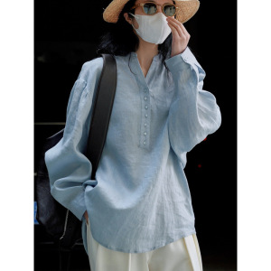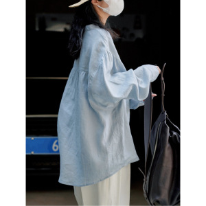 春秋季日系文艺棉麻衬衫女宽松长袖棉麻衬衣防晒度假风休闲上衣女