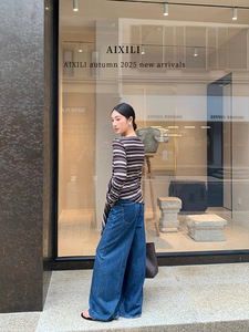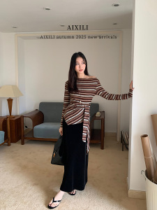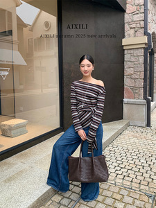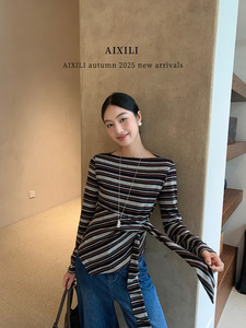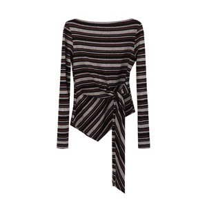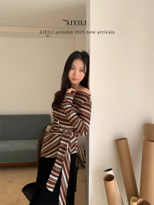 爱西里2025秋松弛感复古撞色条纹设计不规则下摆绑带针织衫15331
