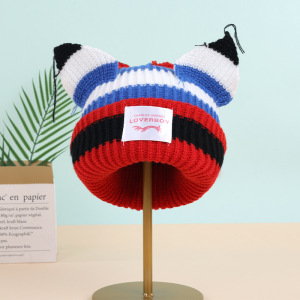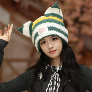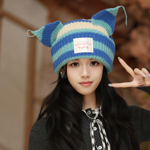 跨境小众设计撞色可爱猫咪耳朵流苏秋冬毛线帽加厚保暖针织帽冷帽