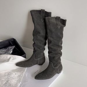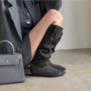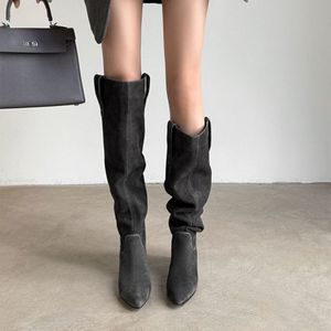2025秋季新款不过膝复古褶皱尖头堆堆靴女套筒低跟百搭显瘦长靴女
