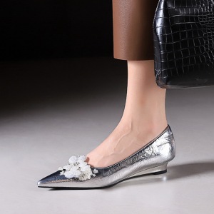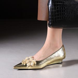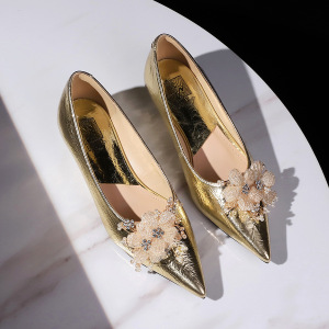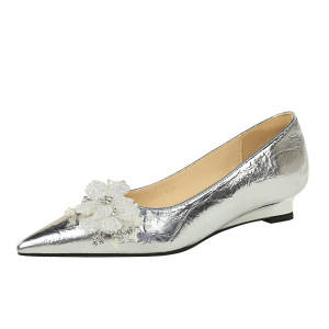 6200-H97韩版尖头坡跟鞋金属手抓纹水钻花朵女鞋一脚蹬浅口单鞋女