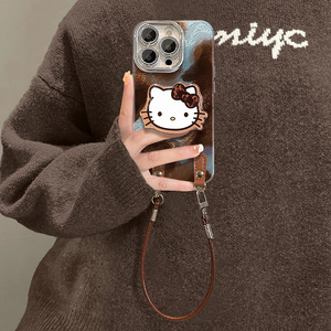 适用苹果16复古手机壳iphone14pro纹kt猫支架挂绳13高级感15max女