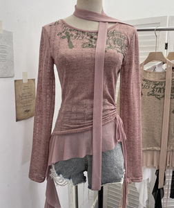实拍 美式镂空印花针织T恤衫女秋装带飘带长袖抽绳不规则上衣8097