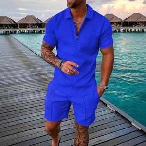 跨境欧码夏季热卖时尚休闲格子印花拉链装饰男士沙滩度假套装