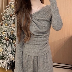 休闲套装女秋冬季纯欲风斜肩修身上衣高腰垂感阔腿裤感两件套