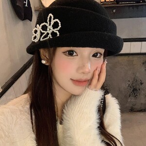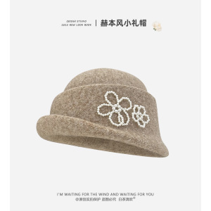 珍珠花朵千金帽子女秋冬季法式复古优雅礼帽显脸小黑色针织马术帽