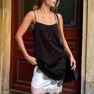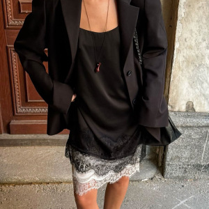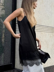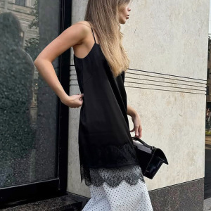 秋冬新款黑色蕾丝拼接色丁吊带连衣裙设计感气质时尚2025跨境通勤