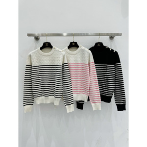 秋冬季新款黑白条纹羊绒长袖套头针织衫女圆领拼色线衫常规款毛衣
