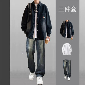 牛仔外套男生潮流套装春秋季薄款夹克高级感青少年帅气穿搭三件套