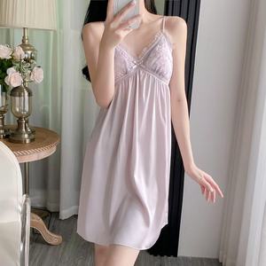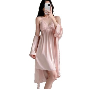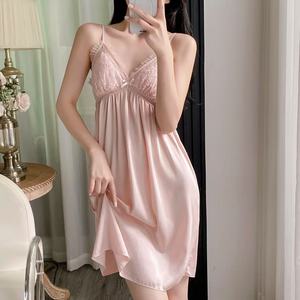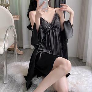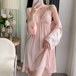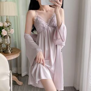 2025新款冰丝睡裙女士带胸垫花边高级感休闲长袖睡袍家居服两件套