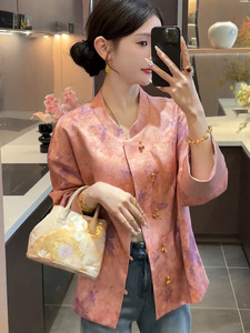 新中式国风立领外套女气质盘扣 提花长袖宽松唐装短款百搭上衣