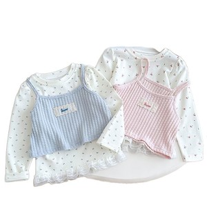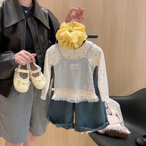 韩系女童秋季套装碎花蕾丝假两件吊带衫+碎花T恤萌趣甜美上衣潮