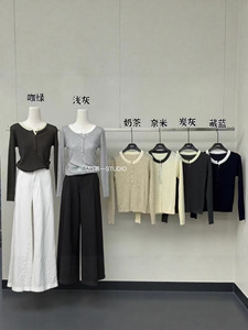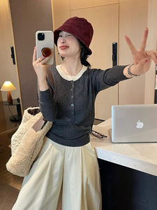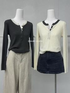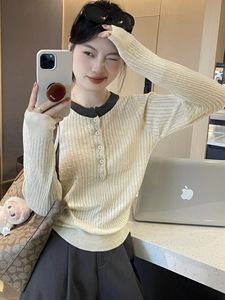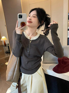 韩系时尚撞色圆领半开领针织衫漂亮流行显瘦2025早秋休闲气质上衣