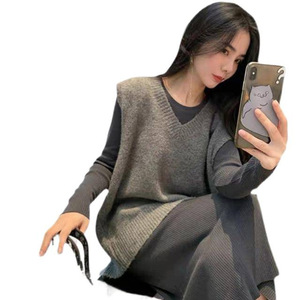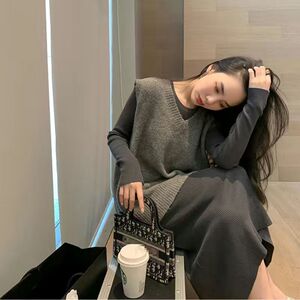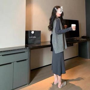 大码胖mm法式不规则套装秋冬开叉马甲+洋气针织连衣裙两件套200斤