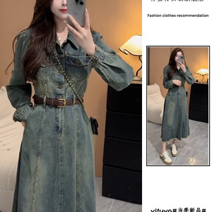 港风复古牛仔连衣裙女春秋季新款小众小个子收腰显瘦长袖A字长裙