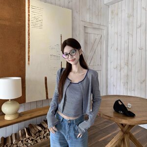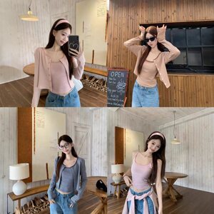 实拍~秋季复古设计感条纹吊带背心女长袖针织开衫外套两件套87349