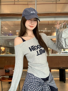 斜肩露肩字母印花长袖T恤女2025早秋新款褶皱修身设计感肩带上衣