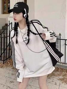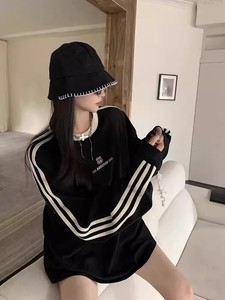美式潮牌黑色三条杠圆领卫衣女春秋新款设计感宽松插肩男女款上衣