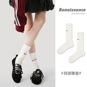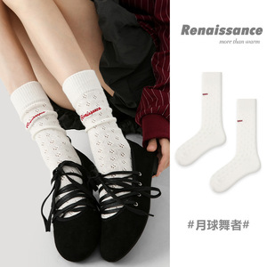 Renaissance秋冬新款中筒袜梅花网眼堆堆袜字母学院风ins潮袜子女