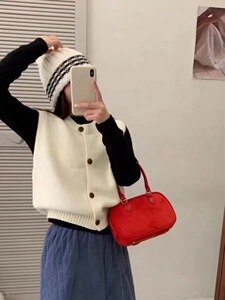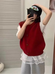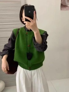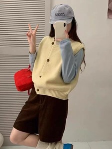 韩系简约圆木扣纯色针织马甲开衫春秋新款软糯坎肩叠穿毛衣背心女