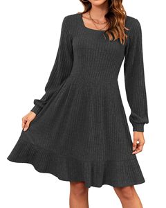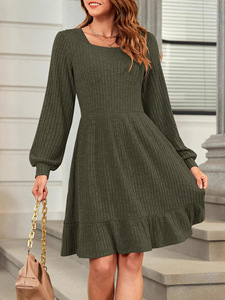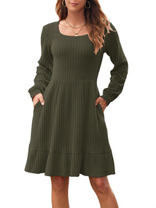 2025欧美外贸跨境女装亚马逊爆款方领女士坑条磨毛长袖休闲连衣裙