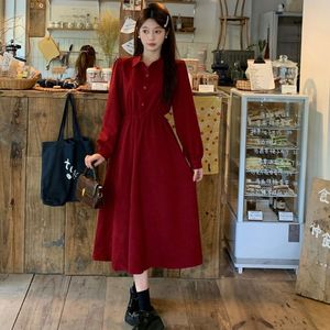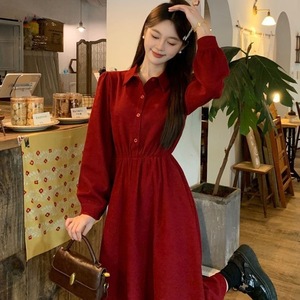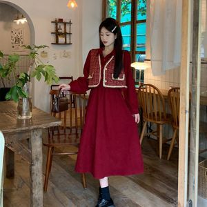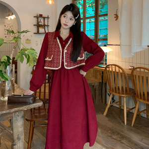 大码胖mm小香风红色连衣裙套装秋冬法式气质灯芯绒宽松长裙两件套
