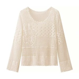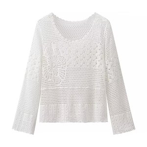 ZR外贸批发 欧美风女装 时尚气质百搭简约镂空针织圆领长袖上衣