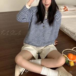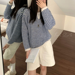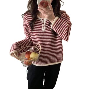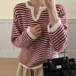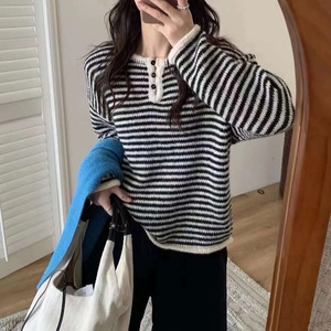 时尚减龄复古条纹针织衫上衣女2025秋冬新款设计感半开领套头毛衣