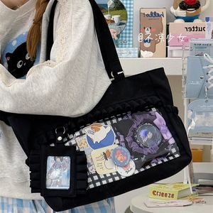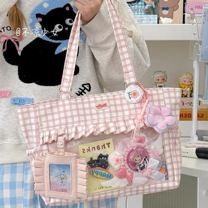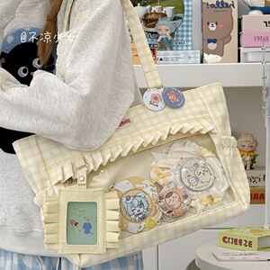 可爱格子荷叶边手提包森系小清新大容量单肩包二次元吧唧痛包娃包