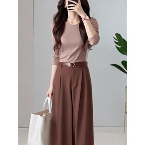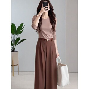 休闲套装气质简约圆领卡其色长袖恤女春季咖色阔腿裤长裤两件套