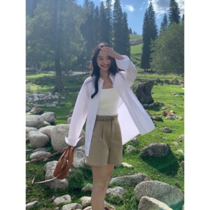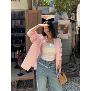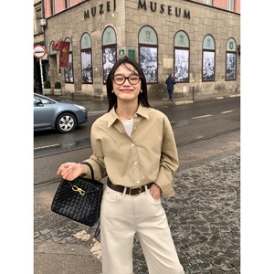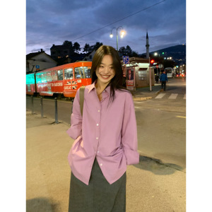 pusumede蓝色长袖衬衫女春季新款宽松休闲基础款衬衣通勤气质上衣