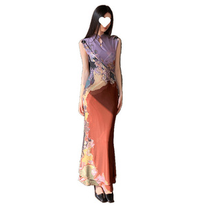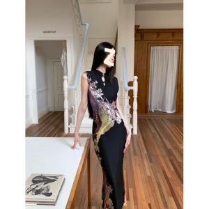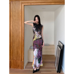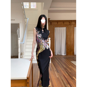 新中式前后两穿撞色旗袍连衣裙女印花鱼尾背心裙收腰包臀国风
